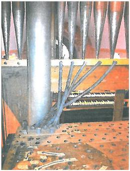 Chaque tuyau de montre ainsi remonté a été relié au sommier qui lui adressera l’air sous pression qui permettra de produire les sons.