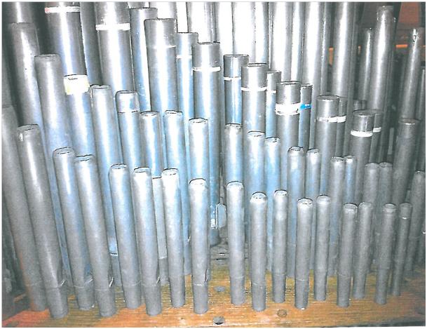 L’essentiel des tuyaux (environ 700 sur 800) de notre orgue sont en métal (alliage étain et plomb). Au démontage, un grand nombre d’entre eux étaient fortement endommagés, cabossés, tordus et déformés par des tentatives d’accord fort maladroites.
